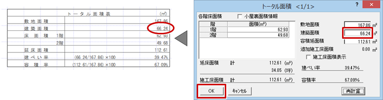 - 「トータル面積」ダイアログの「建築面積」の数値が更新されたことを確認して、「OK」をクリックします。