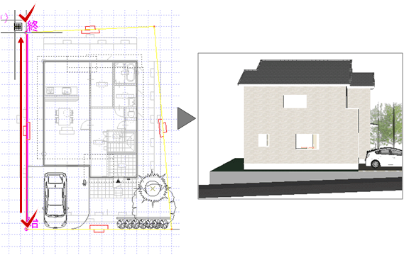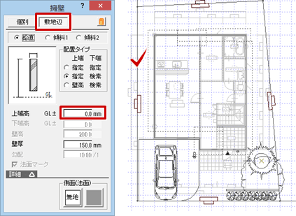 「擁壁」ダイアログの「敷地辺」をON、「上端高」を「0.0」に変更して、敷地をクリックします。