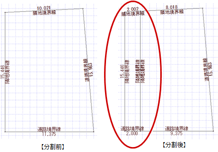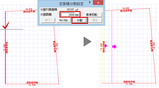 A:「編集」メニューの「敷地定面積分割」を使用して、指定した距離で分割します。