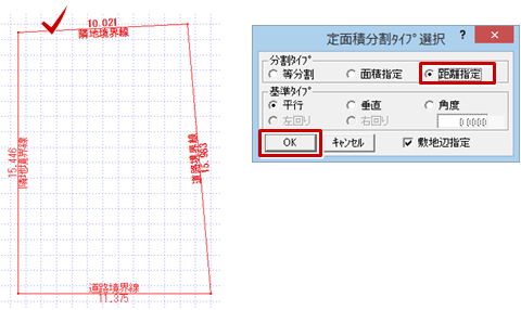 - 「定面積分割タイプ選択」ダイアログの「距離指定」をONにして、「OK」をクリックします。