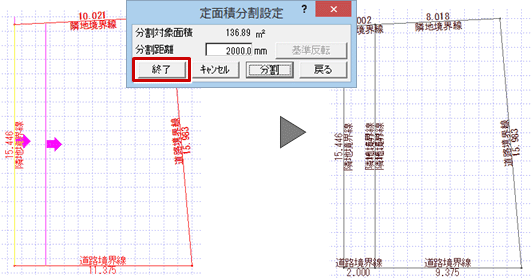 - 分割を終えるときは、「定面積分割設定」ダイアログの「終了」をクリックします。