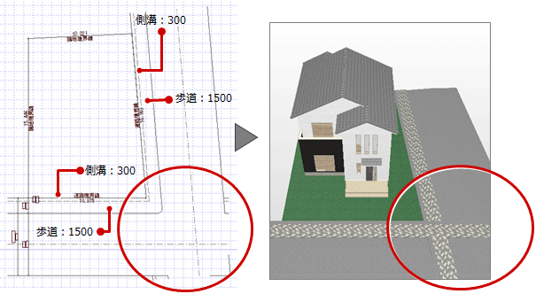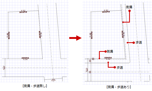 ※「道路」メニューの「道路」から入力した道路に、側溝・水路を設定してもパースには反映されません。