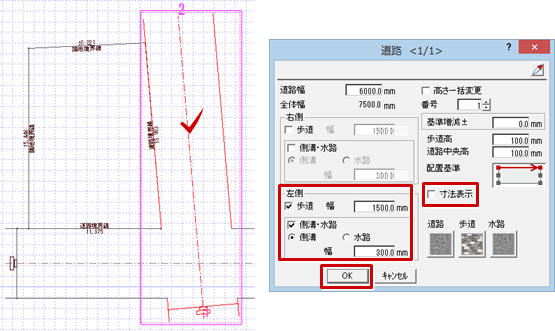 - 「道路」ダイアログの「歩道」、「側溝・水路」「側溝」をONにし、「幅」を設定して、「OK」をクリックします。