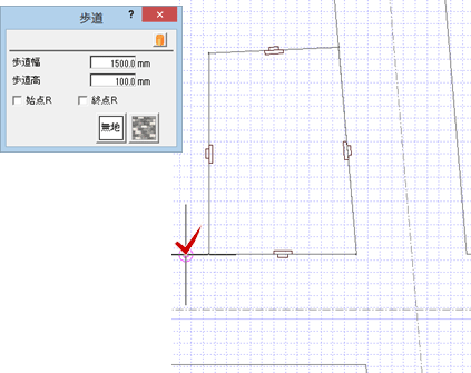 - 「歩道」ダイアログの「歩道幅」や「歩道高」などを設定して、道路をクリックします。