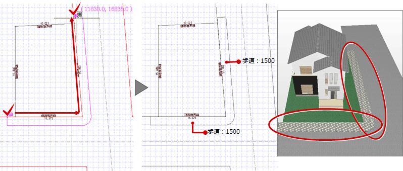 「道路」メニューの「道路」の「道路自動配置」「道路2点」「道路連続線」から入力した場合は属性変更で、「パース用道路」の「道路自動配置」「道路連続線」から入力した場合は「歩道」、「側溝」を使用します。