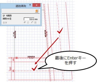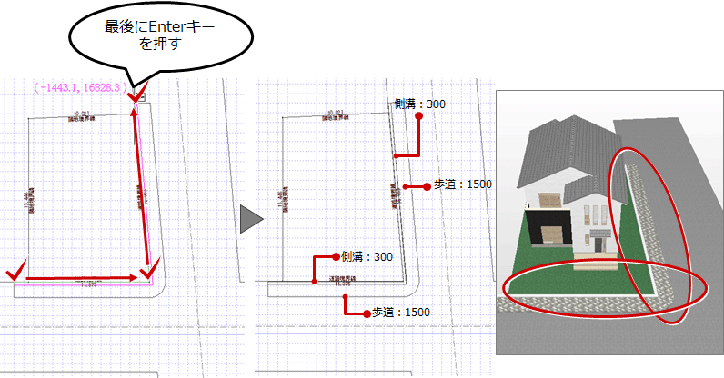 - 側溝の配置位置を順にクリックし、最後にEnterキーを押します。