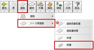 - 「道路」メニューから「パース用道路」の「側溝」を選びます。