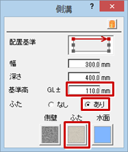 - ここでは歩道に埋もれないように「側溝」ダイアログの「基準高」を「110」、「ふた」を「あり」、ふたの素材を指定します。