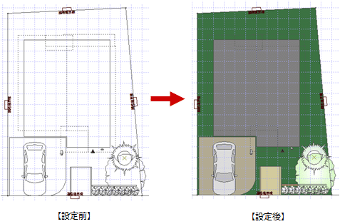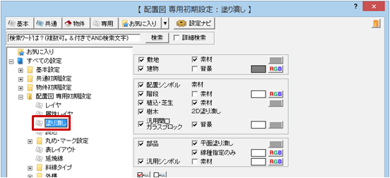 配置図の専用初期設定の「塗り潰し」の内容が初期値となります。なお、配置図で「塗り潰し」ダイアログの設定をして塗り潰し処理を実行すると、その設定内容が専用初期設定の「塗り潰し」に反映されます。