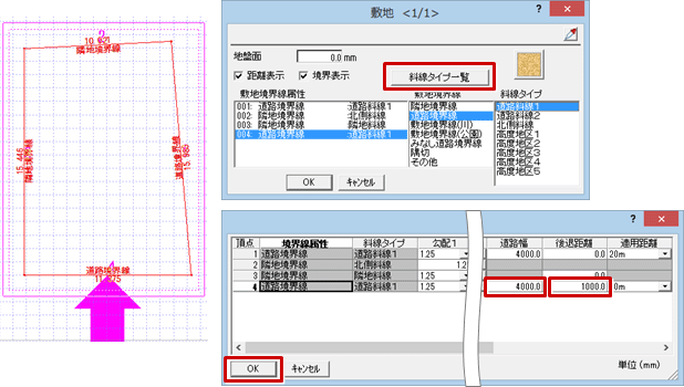 - ここでは「道路幅」を「4000」、「後退距離」を「1000」と変更して、「OK」をクリックします。