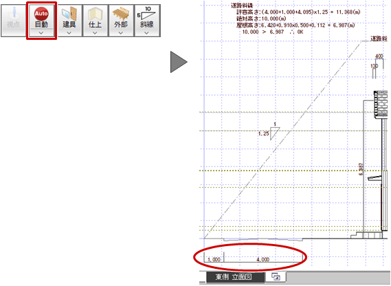 - 立面図を開き、「自動立上」をクリックして、立面図を再作成します。