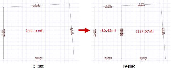 A:「編集」メニューの「敷地定面積分割」の「面積指定」を使用して、面積を指定して敷地を分割します。