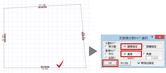 - 「定面積分割タイプ選択」ダイアログの「分割タイプ」の「面積指定」をONにします。
