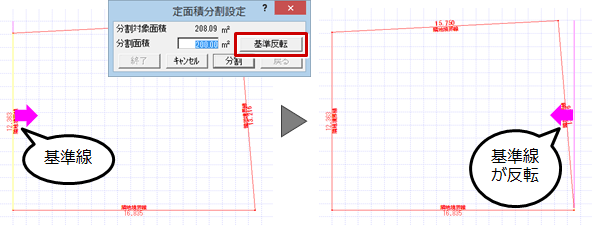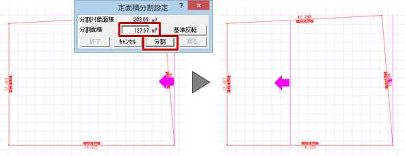 基準線の位置が反転します。 - 「定面積分割設定」ダイアログの「分割面積」を設定して、「分割」をクリックします。