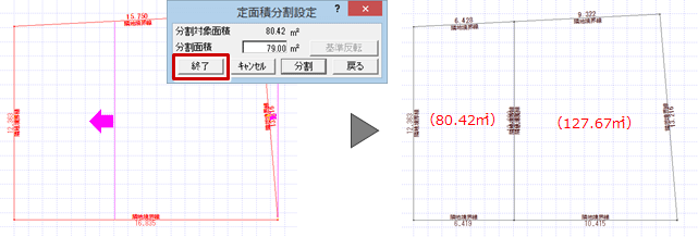 右側の垂直の基準線から「127.67㎡」となるように分割位置が設定されます。 - この分割位置でよい場合は、「終了」をクリックします。