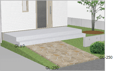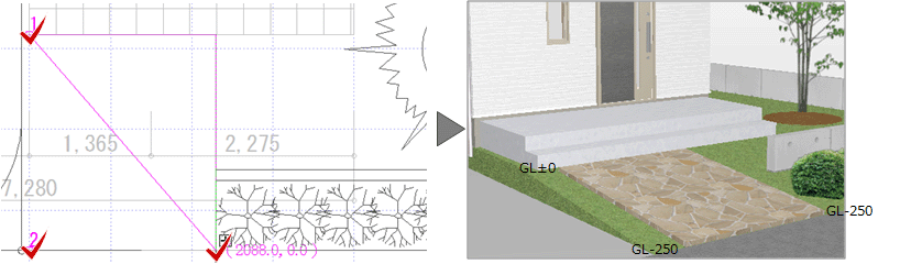 A:「外構」メニューの「アプローチ」の「アプローチ」を使用して、3つの頂点の高さを指定して傾斜にします。