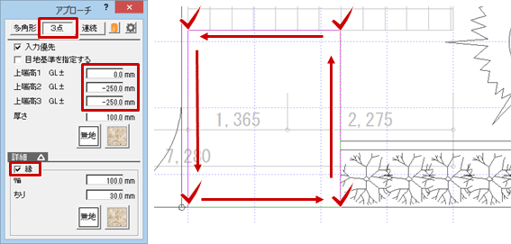 - 「アプローチ」ダイアログの「3点」をONにして、「上端高1」「上端高2」「上端高3」を設定します。