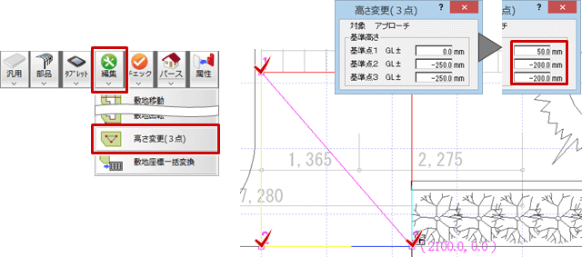 - 入力済みのアプローチの高さを変更する場合は、「編集」メニューの「高さ変更(3点)」を使用して、「高さ変更」ダイアログで高さを変更し、もう一度基準点1、基準点2、基準点3をクリックします。
