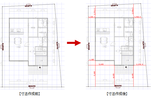 A:「建物」メニューの「建物区画位置寸法作成」を使用して、寸法線を作成します。
