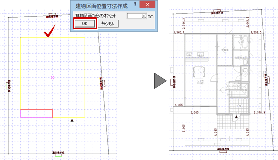- 建物区画の線上をクリックして、「建物区画位置寸法作成」ダイアログの「OK」をクリックします。