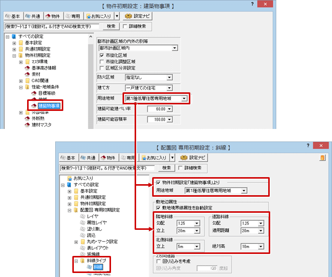 配置図の「専用初期設定:斜線タイプ-斜線」の「用途地域」について