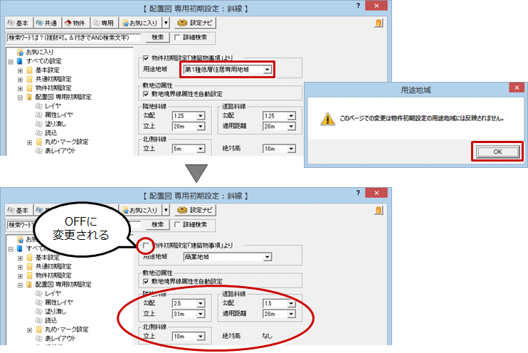 このとき、この変更は物件初期設定の用途地域には反映されない旨の確認画面が表示されます。「OK」をクリックすると、「物件初期設定「建築物事項」より」がOFFになり、その用途地域の斜線の規定(初期値)が取り込まれます。必要に応じて、各設定を変更します。