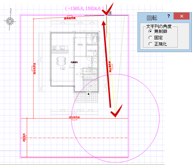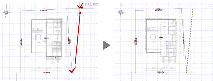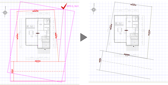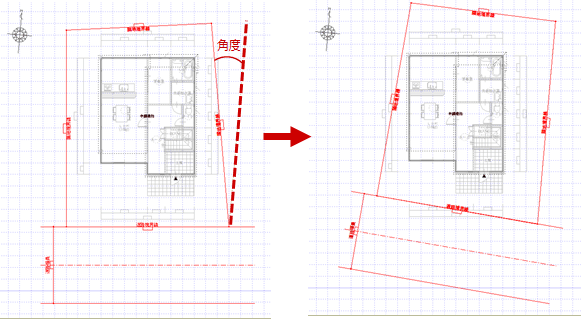 ※ 敷地辺と建物区画の辺が平行になるように敷地を回転するときは、「編集」メニューの「敷地回転」を使用します。