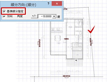 - 「線分方向」ダイアログの「基準線分指定」がONであることを確認して、基準線をクリックします。