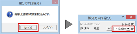- 確認画面で「はい」をクリックして、「線分方向」ダイアログの「角度」に基準線からの角度を入力します。