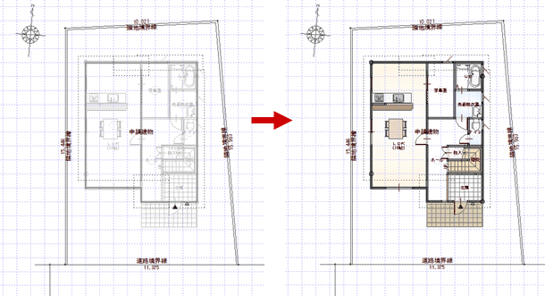 - 平面図の塗り潰しが不要な場合は、平面図で「自動」メニューの「塗り潰し処理選択」を使って塗り潰しなしに変更してから、配置図に取り込んでください。