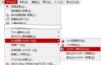 - 「ファイル」メニューから「バック図面・バックデータ」の「バックデータ取り込み」を選びます。