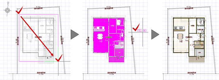※ 基本、「002 データ002」~「005 データ005」は使用していません。他のデータが入力されていないレイヤを使用することをお勧めします。 - 平面図を取り込む範囲を指定して、左クリックで「YES」を指定します。