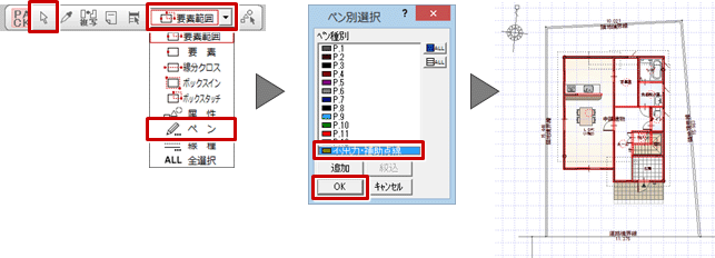 - 「ペン別選択」ダイアログで「不出力・補助点線」を選び、「OK」をクリックします。
