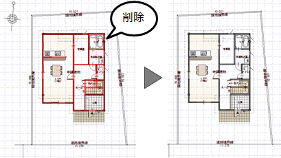 ※ 平面図の仕上線以外に、配置図と平面図に不出力線、補助点線があるとこれらも選択されてしまいます。 - キーボードのDeleteキーを押して、データを削除します。