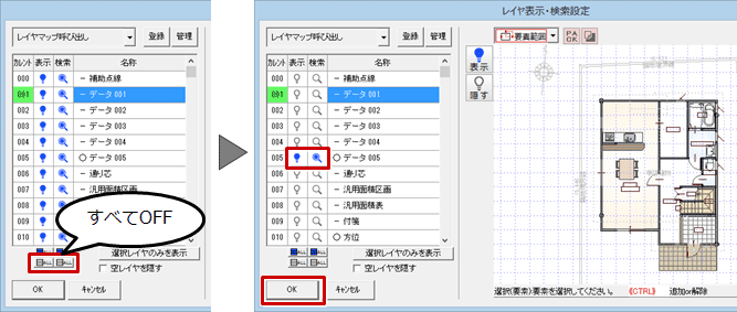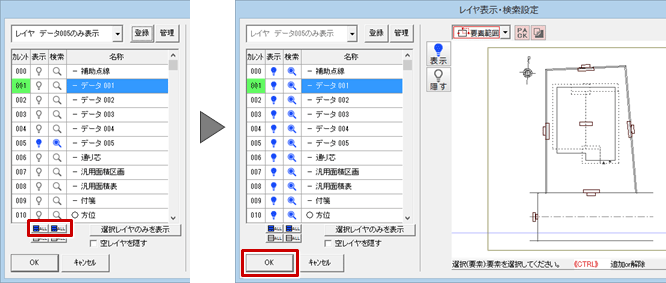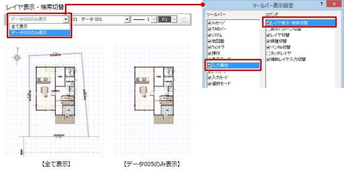 - 平面図の取り込みが頻繁に発生するような場合、「レイヤ表示・検索設定」で「データ 005」のみを表示したレイヤマップを登録します。共通ツールバーに「レイヤ表示・検索切替」を表示しておくと、簡単にレイヤマップを切り替えることができます。