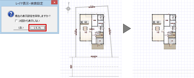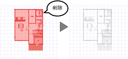 - 「バックデータ取り込み」では平面図の仕上データ(不出力線)まで取り込まれます。これらのデータが不要の場合は削除します。