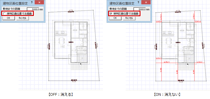 「建物区画位置寸法描画」をONにすると、既存の寸法線は一旦削除され再度自動作成されます。寸法線を部分的に削除したり、移動した場合は自動配置後に編集をしてください。