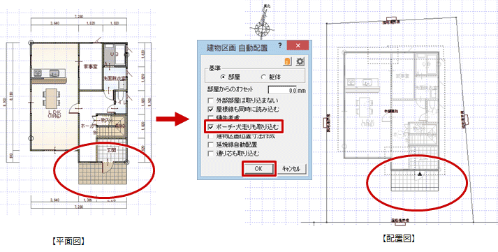 A:「建物」メニューの「建物区画」の「建物区画自動配置」で、「ポーチ・犬走りも取り込む」をONにして取り込みます。