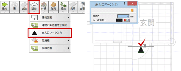 「建物」メニューの「建物区画」の「建物区画自動配置」を実行すると、玄関に出入り口マークが自動配置されます。
