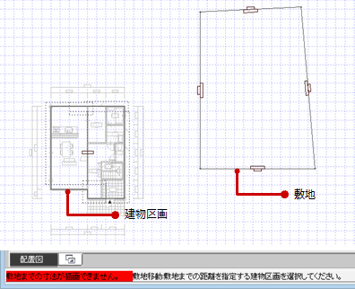 A:建物区画が敷地から完全にはみ出している場合は、敷地までの距離が表示できないためエラーメッセージが表示されます。建物区画が敷地に含まれるように敷地を移動した後、「敷地移動」を実行してください。