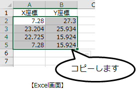 Excelの画面でX座標、Y座標の値をコピーしておきます。