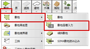 - 配置図を開き、「敷地」メニューから「敷地」の「敷地座標入力」を選びます。