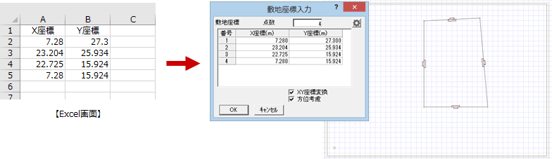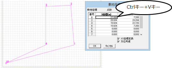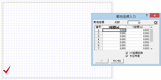 A:Excelの座標データを直接取り込む機能はありません。あらかじめExcelで座標をコピーし、「敷地座標入力」ダイアログに座標を貼り付けて敷地を入力します。