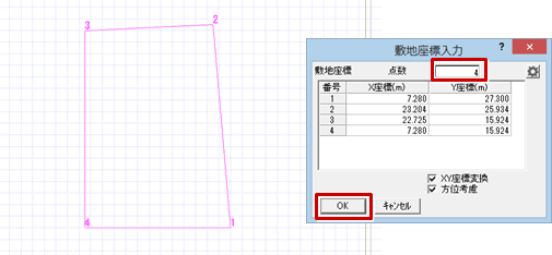 - ここでは座標は番号4までのため、「点数」を「4」にして、「OK」をクリックします。