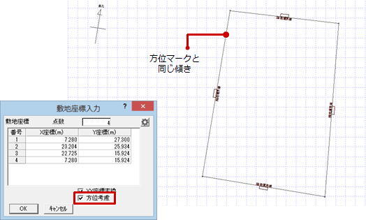 Q:「敷地座標入力」ダイアログの「方位考慮」について教えてください。
