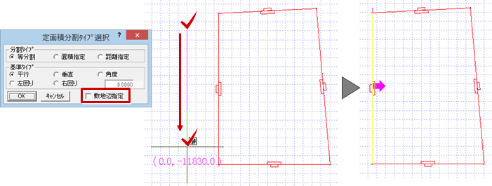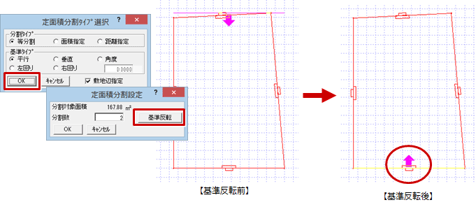 敷地の形状によっては、「基準反転」で反転しない場合があります。その場合は「定面積分割タイプ選択」ダイアログの「敷地辺指定」をOFFにして、マウスで基準線を指定してください。