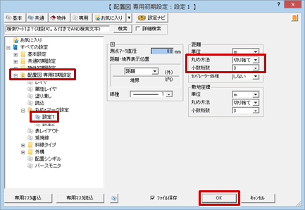 「専用初期設定:丸め・マーク設定-設定1」の「距離」の「丸め方法」、「小数桁数」を変更して、「OK」をクリックします。