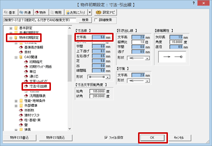 - 「物件初期設定:CAD関連-寸法・引出線」の「寸法線」の「文字高」を変更して、「OK」をクリックします。