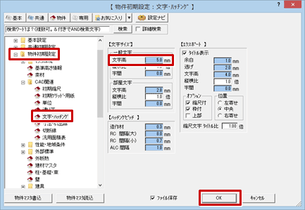 - 「物件初期設定:CAD関連-文字・ハッチング」の「一般文字」の「文字高」を変更して、「OK」をクリックします。