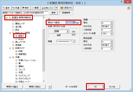 「専用初期設定:丸め・マーク設定」の「設定1」の「測点マーク直径」を変更して、「OK」をクリックします。